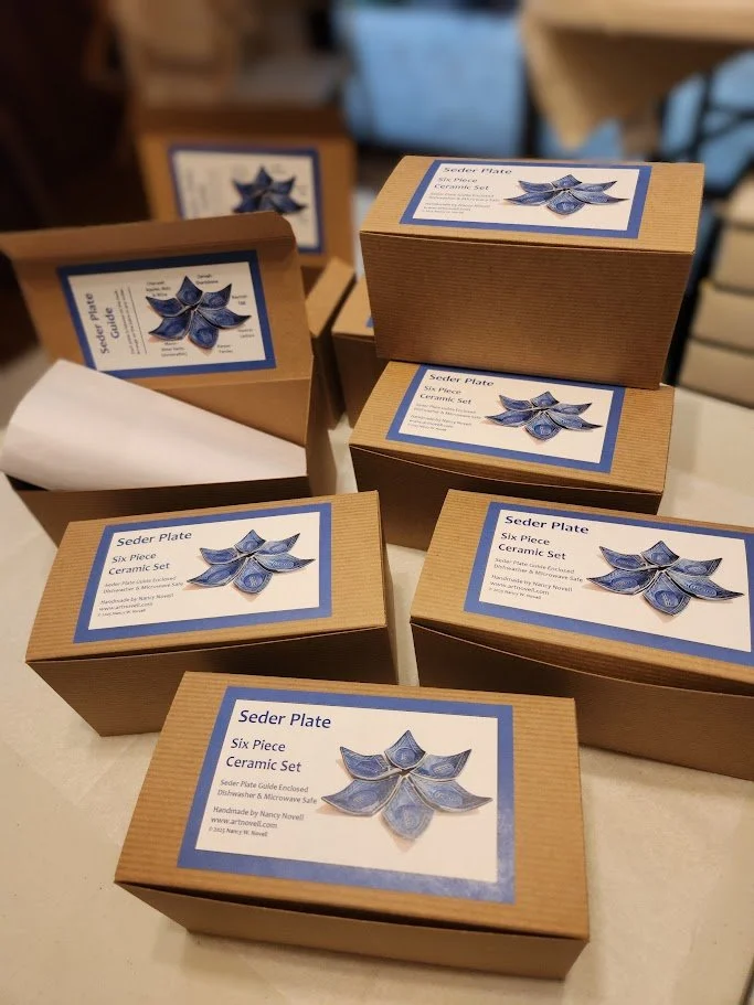 Nancy’s handcrafted ceramic Judaica includes mezuzot, shalom plates and platters, and more. Looking for something specific? Email me and let me know!